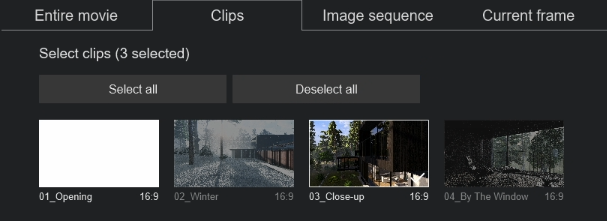Clips within the same Clip Set can now be rendered to individual '.MP4' files when selected via the Clips tab. This tab is visible when clicking the Render Movie button while Entire Movie is selected or one of the Clips is selected.