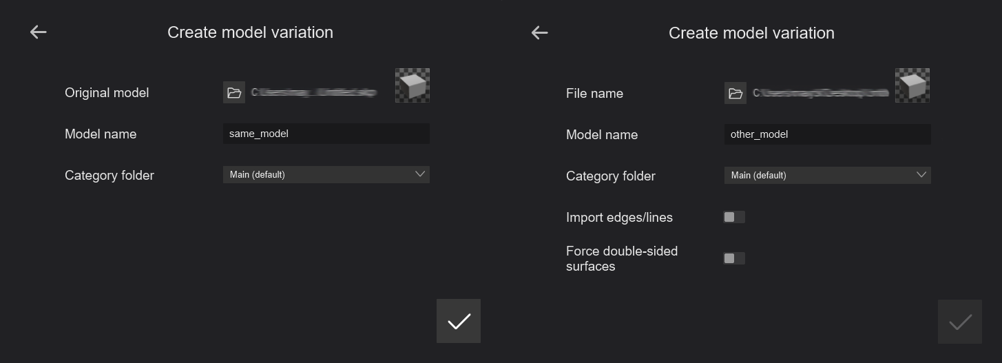 Creating a Variation will toggle a panel that allows for either the duplication of the current Imported Model (example left) or importing a new model (example right):