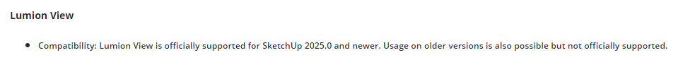 Note: as of 6 May 2025 the Extension information shows the Lumion Plugin compatibility for these versions of SketchUp. Those versions refer to LiveSync for Sketchup (version 4.0+)!