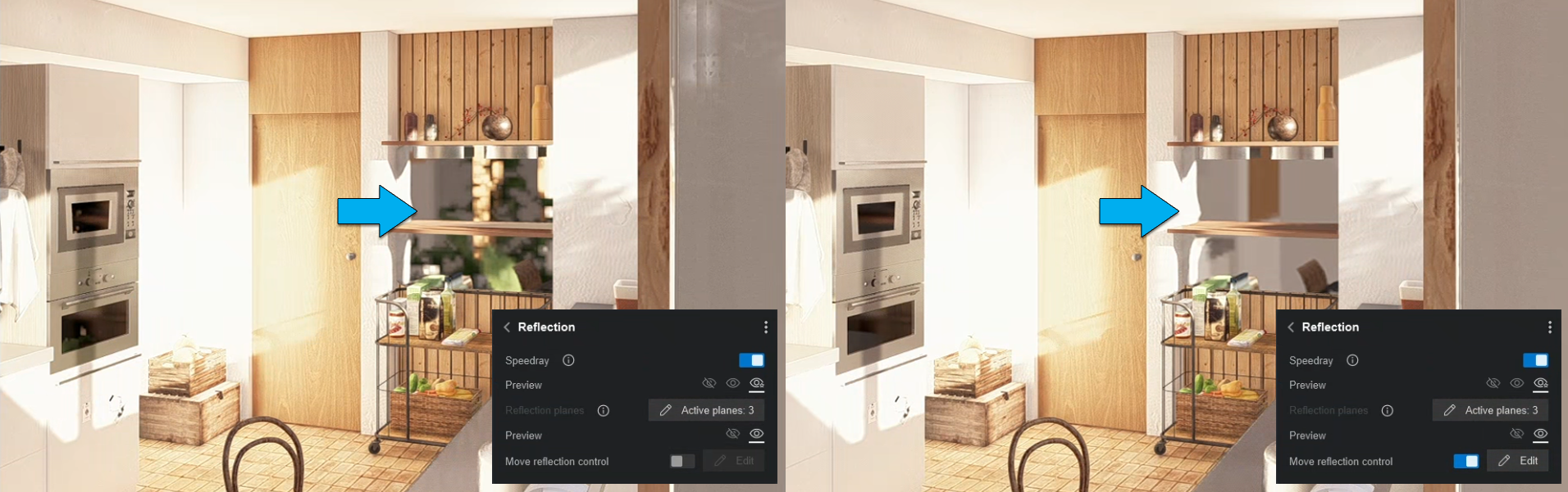 A new option has been added to the Reflection Effect that enables changing the position of the Reflection Control Object from the default camera location if one has already been placed in Build Mode.