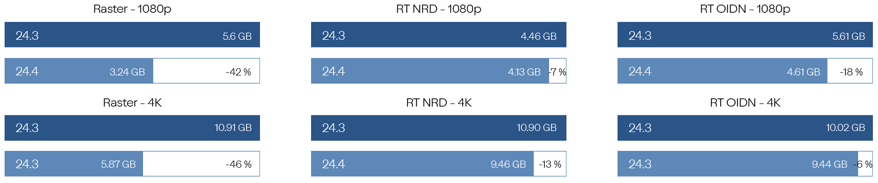 The graphics card (video) memory in Lumion 24.4 has been improved during real-time navigation and, especially, during rendering. Switching between Modes will now allocate graphic resources necessary only for the active mode, resulting in graphics card memory usage reduction of up to 40% in certain situations. The table below shows some of the differences: