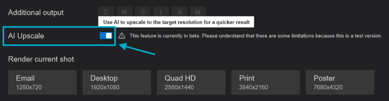 When enabled, Lumion will render the image at half the selected resolution(dimensions) and then upscale it (locally) to the target size. Both the original and AI-upscaled images are saved, giving you the option to compare or use either version.