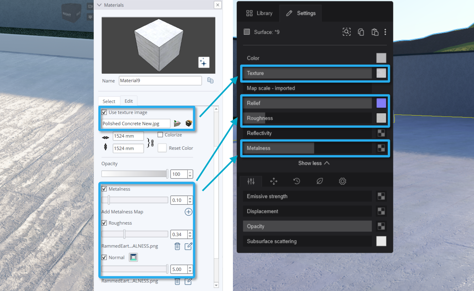 The following Material settings and texture maps defined in SketchUp are preserved and translated into Lumion when the model is imported: