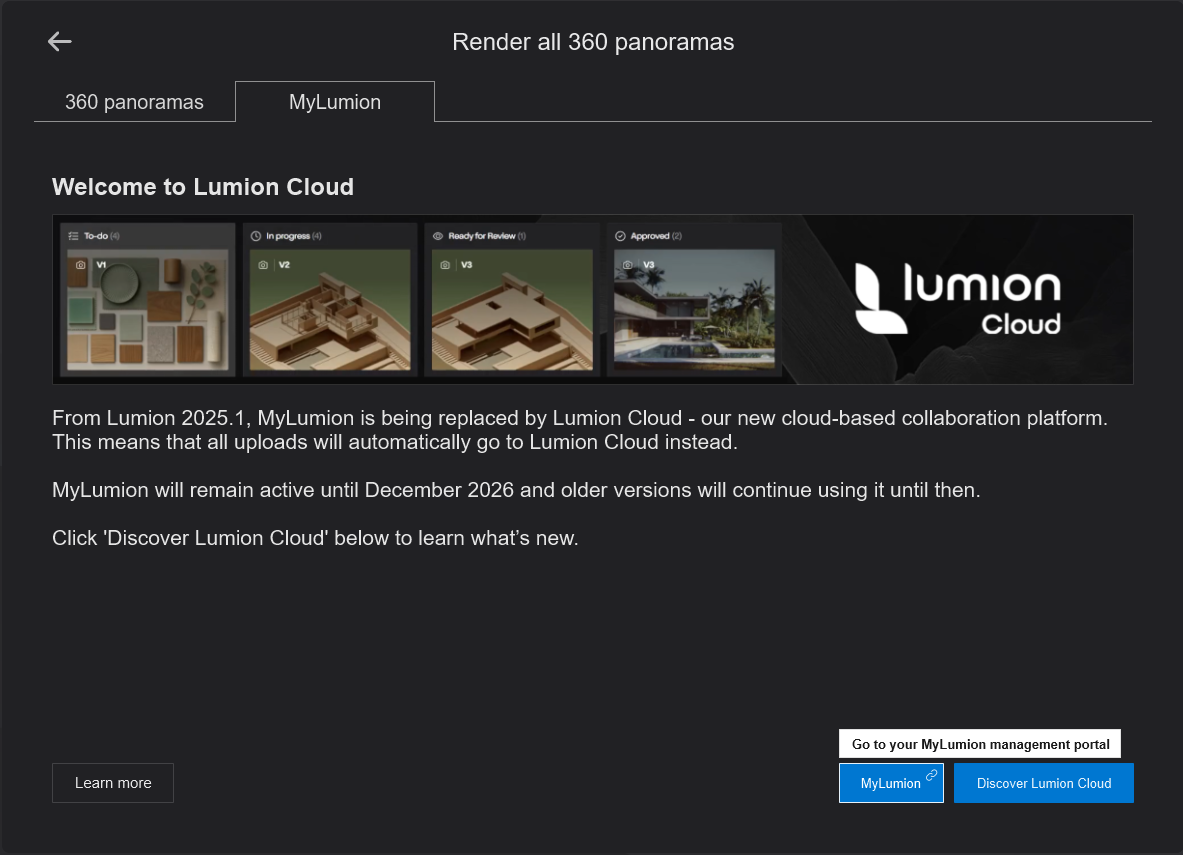 As part of Lumion’s evolution toward a more modern and unified experience, all MyLumion Panorama sharing and media management will move to Lumion Cloud, our new, streamlined platform for managing and sharing your Lumion renders.