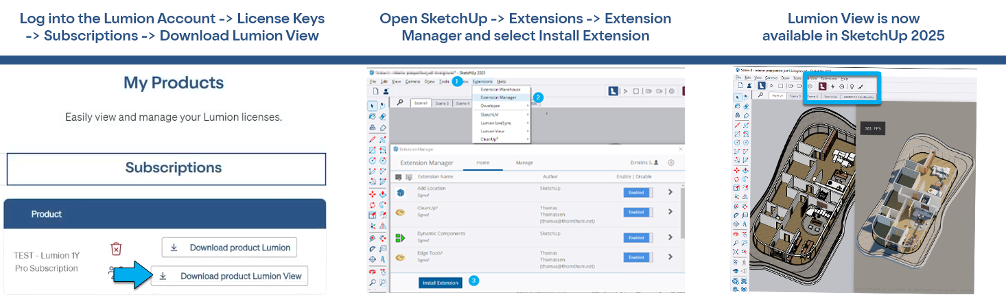 Install via your Lumion Account or via SketchUp Extension Manager: