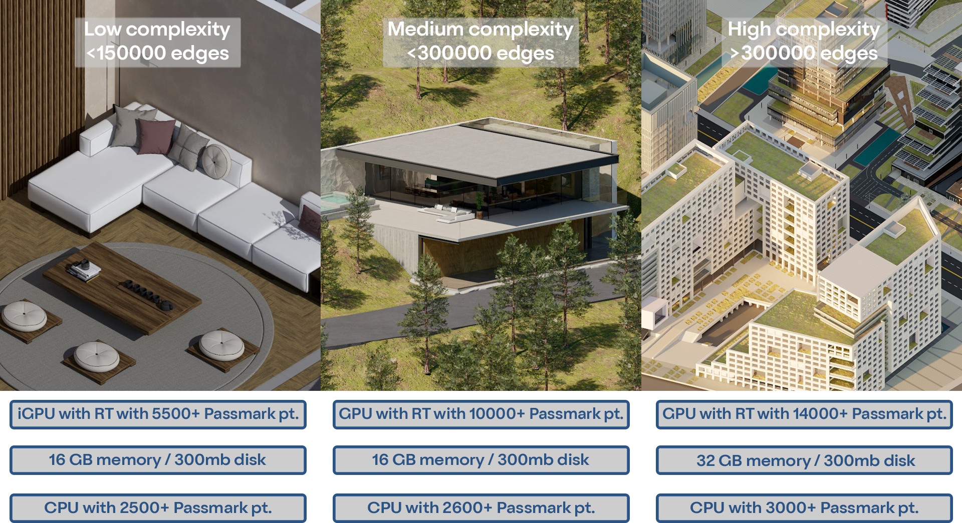 The PC must support Ray Tracing and have suitable performance for the 3D data and rendering of models (depending on how complex they are).
