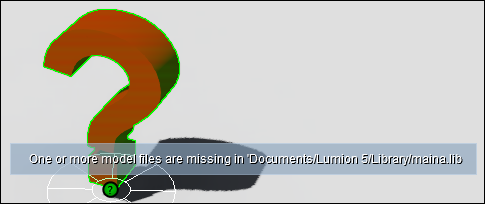 1.2: To get the missing model to appear again, please search for the missing files on your harddisk and network drives. If you find the missing files and they are the four Imported Model Library files, then move them to the Library folder and restart Lumion.