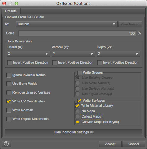 1.2: Go to Export and select OBJ, copy the options as seen in the screenshot below and save the .OBJ file.
