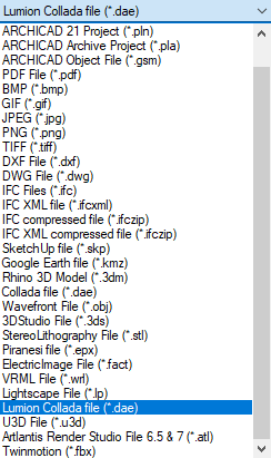 Make sure that you select the correct Lumion Collada file (.DAE) option: