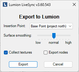 Options for which setting is dependent on the use of either LiveSync (direct/live) or Export to Lumion as above in section 2.