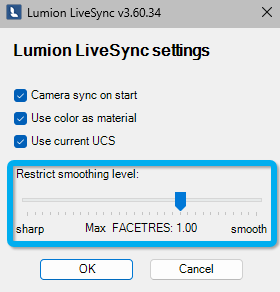 Lumion 10.3 and newer and LiveSync versions from to v3.60.23: Tessellation of imported .DWG files is controlled by their FACETRES value in Autodesk AutoCAD. You can access that value and control it now directly within the plugin interface.