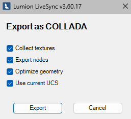 3.1: We recommend exporting the model via LiveSync rather than via .DAE format as it is faster and requires fewer resources. However, if you prefer to export your model via a file, you can export a Lumion Collada file (.DAE) using the Lumion LiveSync for BricsCAD Export button in the palette. Then import the .DAE file in Lumion: