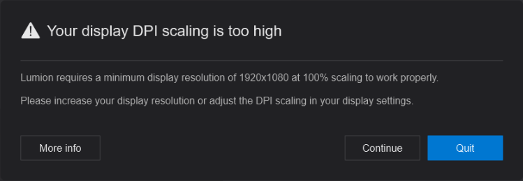 - The screen resolution is too low. Lumion requires a minimum screen resolution of 1920x1080.
