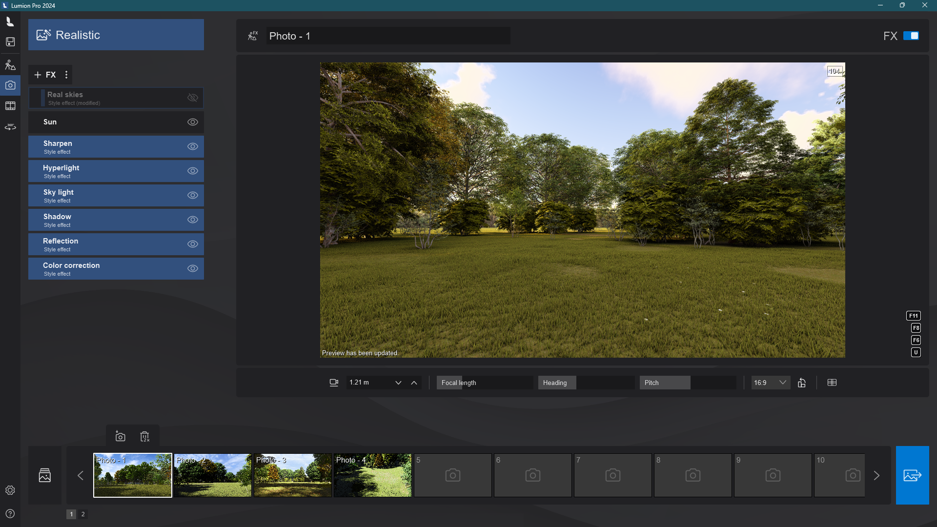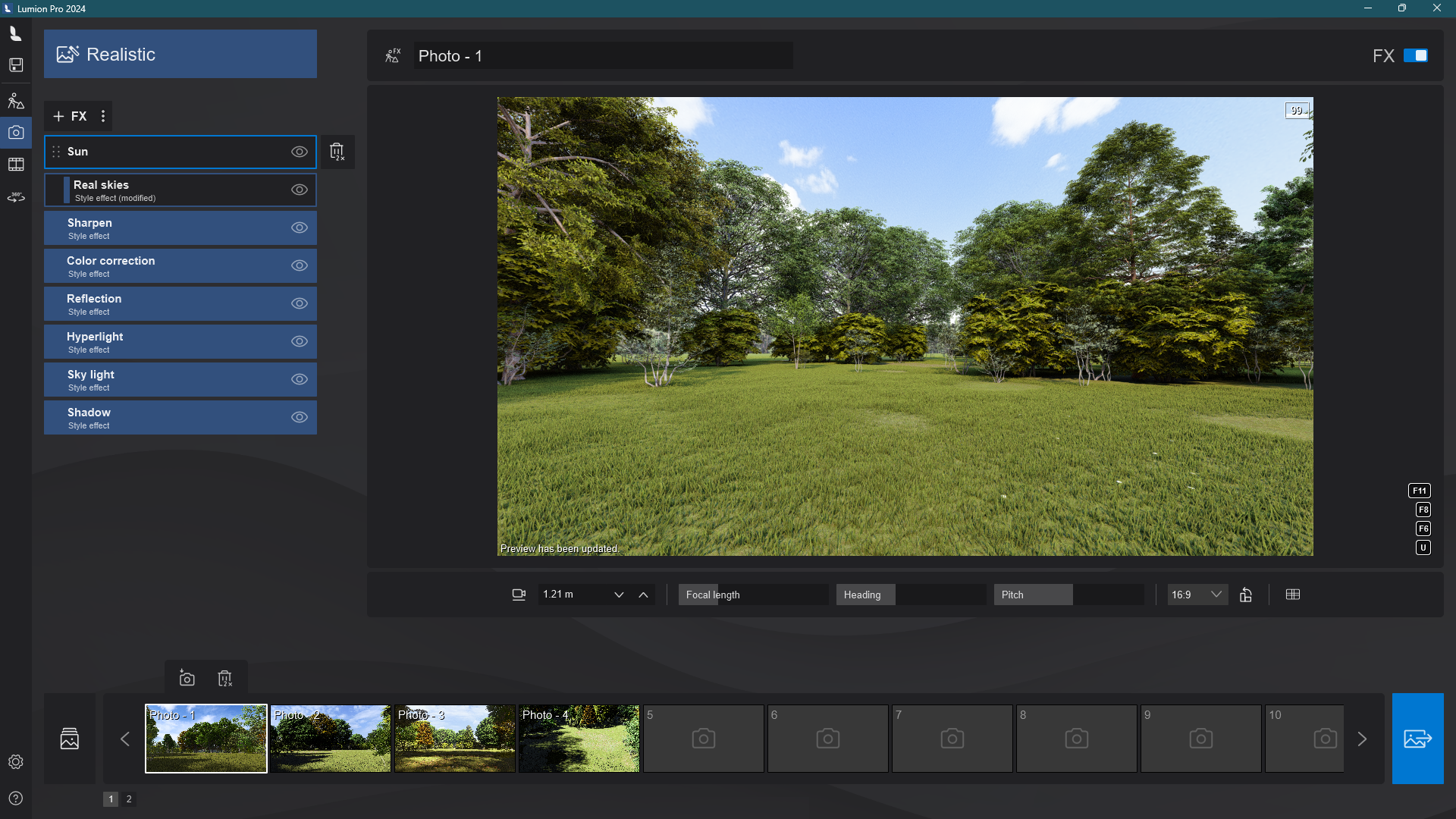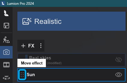 1.2: The Real Skies Effect can be turned on again in Photo or Movie Mode, and you will be able to change the sun using the Sun Effect.