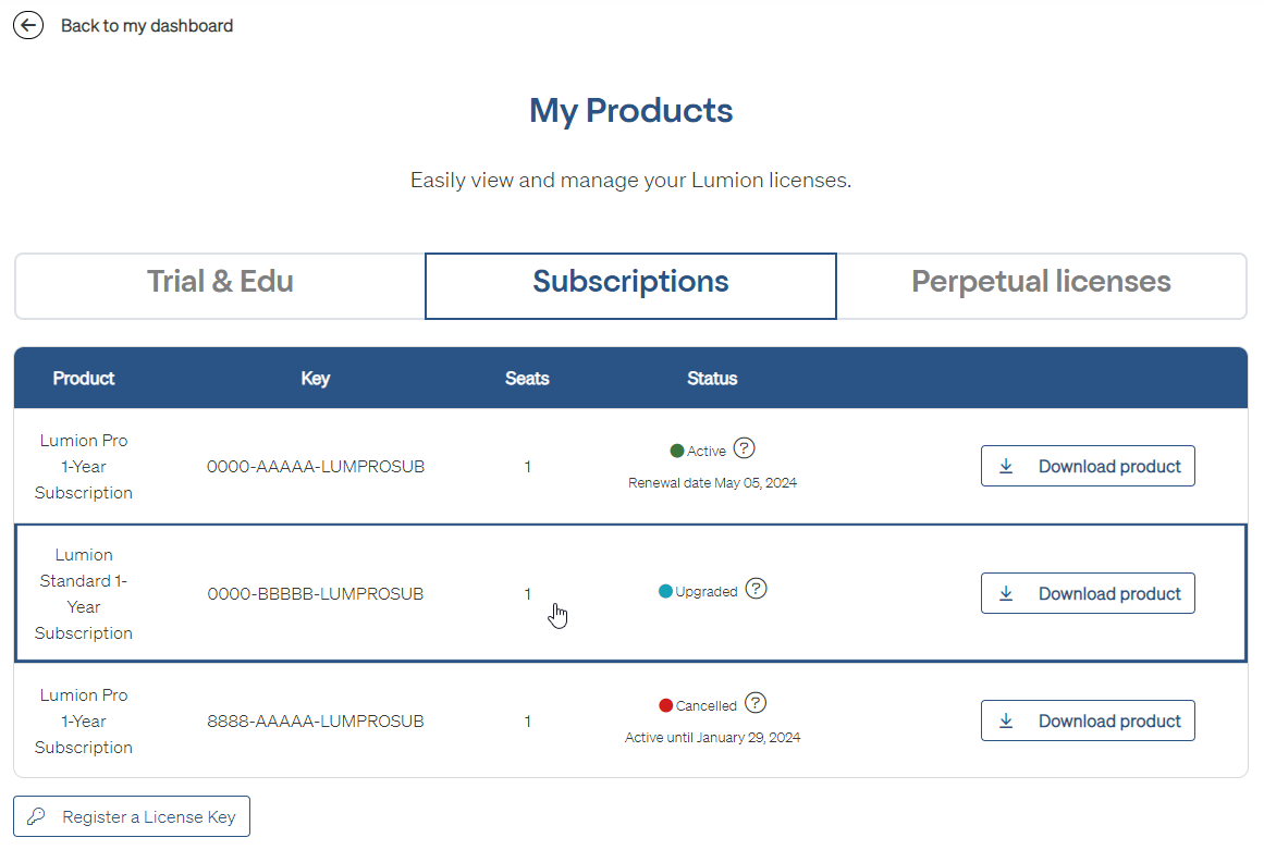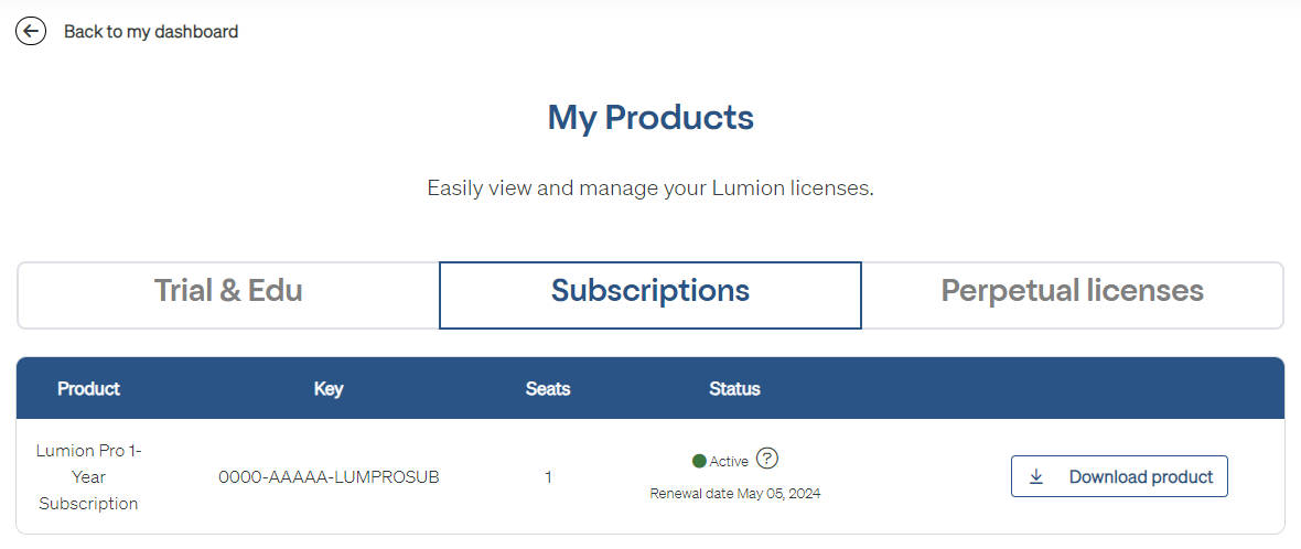 If you are an administrator of the Subscription Key, then the Lumion Account will also allow you to increase the number of Seats, associated with your License Key: