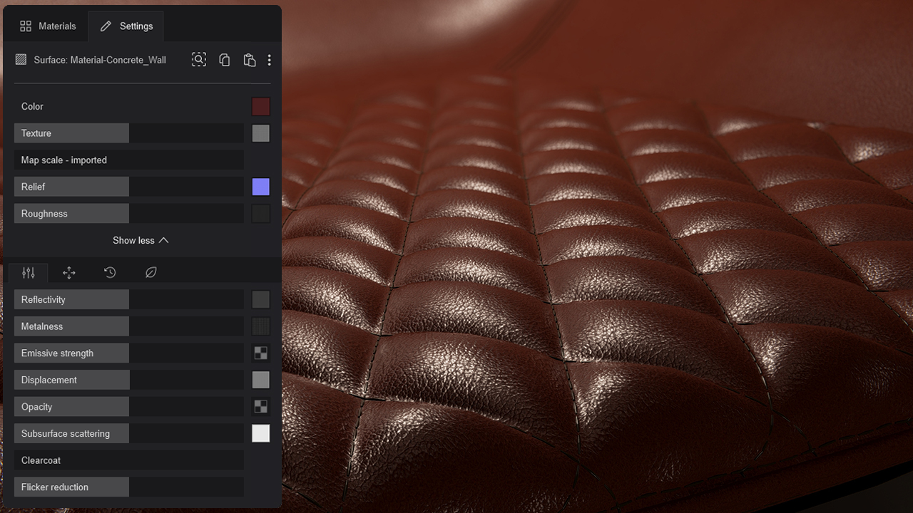 The Material workflow has been converted to full Physically Based Rendering taking advantage of 8 Maps that bring your design choices closer to reality. The result will render more natural physical properties through the accurate calculation of light conditions and a higher degree of control over the Material Settings: