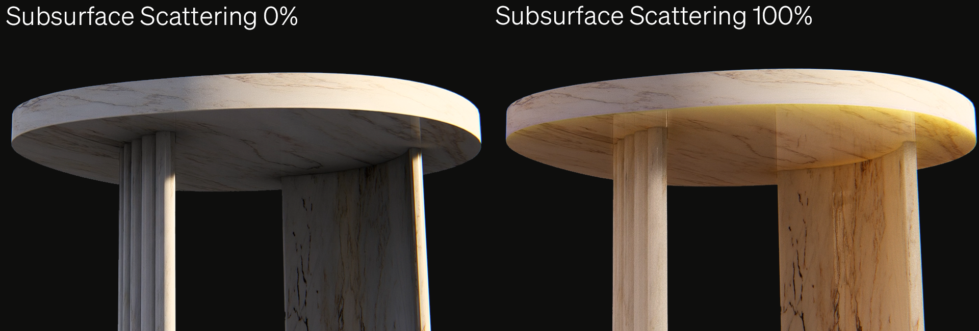 - Subsurface Scattering (SSS): increasing the slider value will give an object/surface a translucent effect, allowing light to penetrate and be scattered by the material. Assigning a color other than white (#FFFFFF) will affect the tint of the light scattered by the Material.