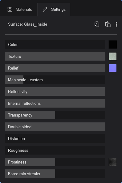 - Frostiness: The Frostiness slider controls the translucency of the surface without affecting the amount of light going through. Using a Map will isolate areas affected by the Frostiness slider.