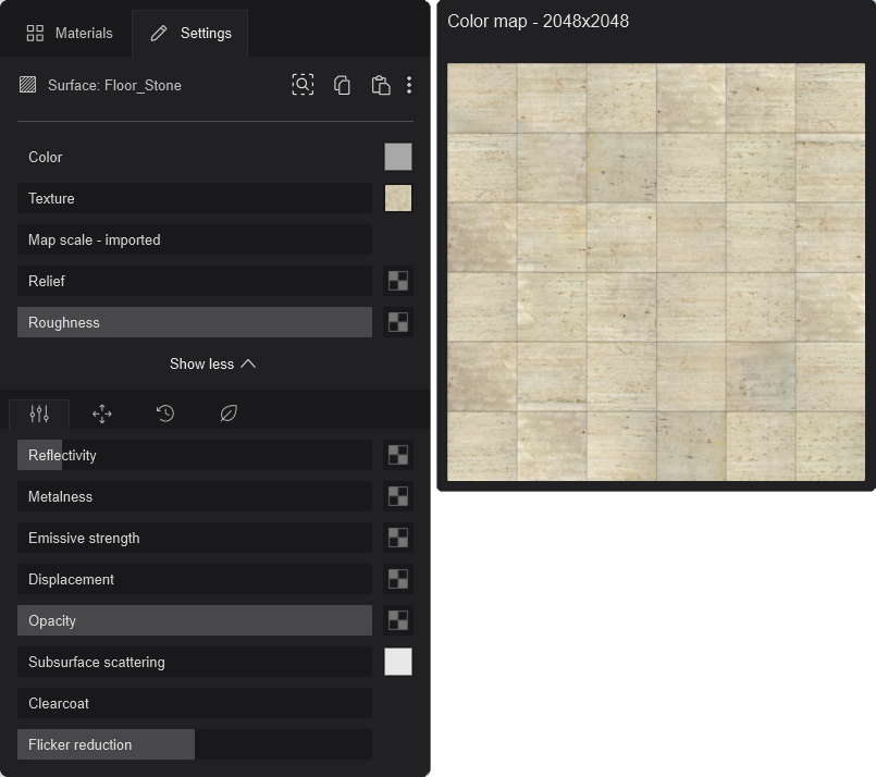 - Opacity: The Opacity Slider controls how see-through a surface is and replaces the Transparency from Lumion 12.5 and older versions. Loading an Opacity Map will allow the slider to control only areas of the surface that are not completely black.