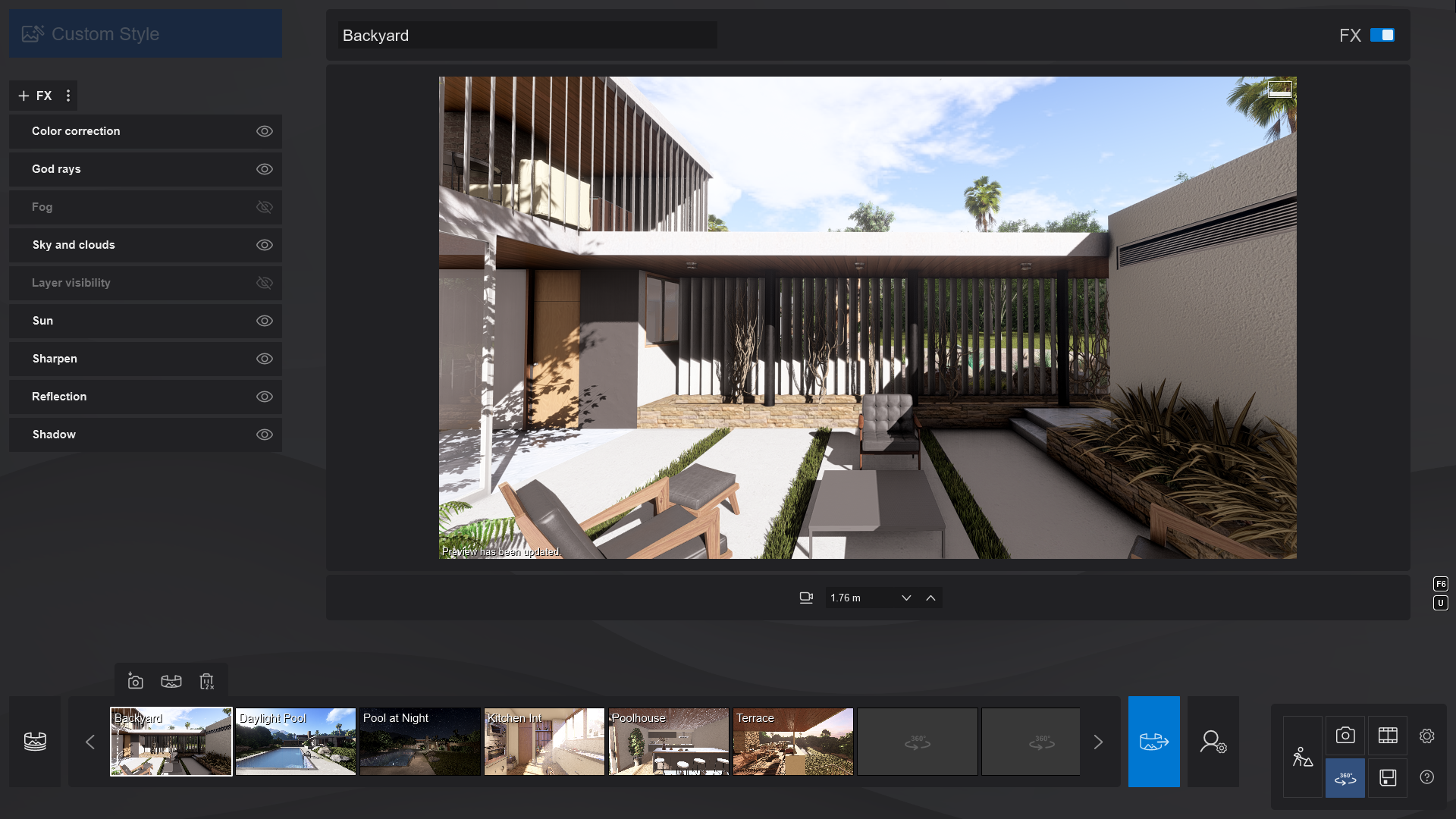 The capabilities and interactions of the Ray Tracing Effect will be expanded and improved during upcoming releases of Lumion through the new Updater. Certain limitations are currently applicable described in section 3.10. More information on the Ray Tracing Effect can be found below:
