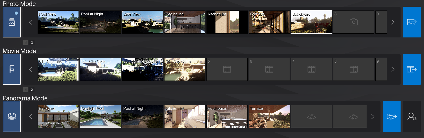 Create animations quicker and easier than ever with a wider range of video camera presets. Enjoy greater control over your camera position and benefit from smoother camera movements with the following new presets. Lumion 2023 contains new presets for camera paths while recording a Clip: