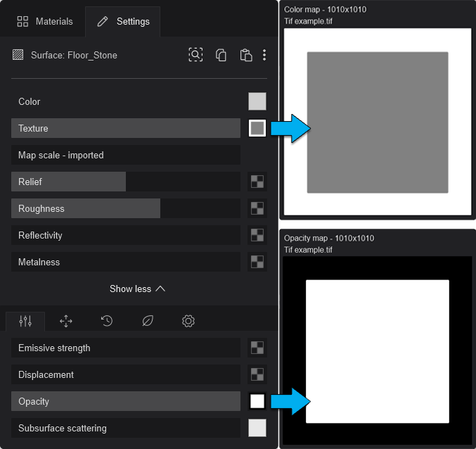 - Materials -> Maps: Assigning a .TIF file to the Texture Map slot will automatically assign the Alpha Channel of the texture to the Opacity Map slot.
